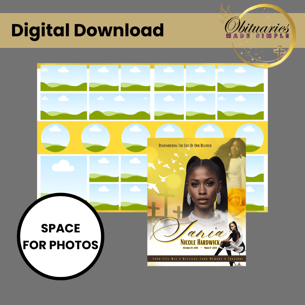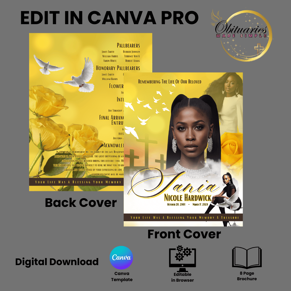 Our Yellow Roses and Brown template features warm tones, elegant layout options, and space to reflect your loved oneโs unique story.