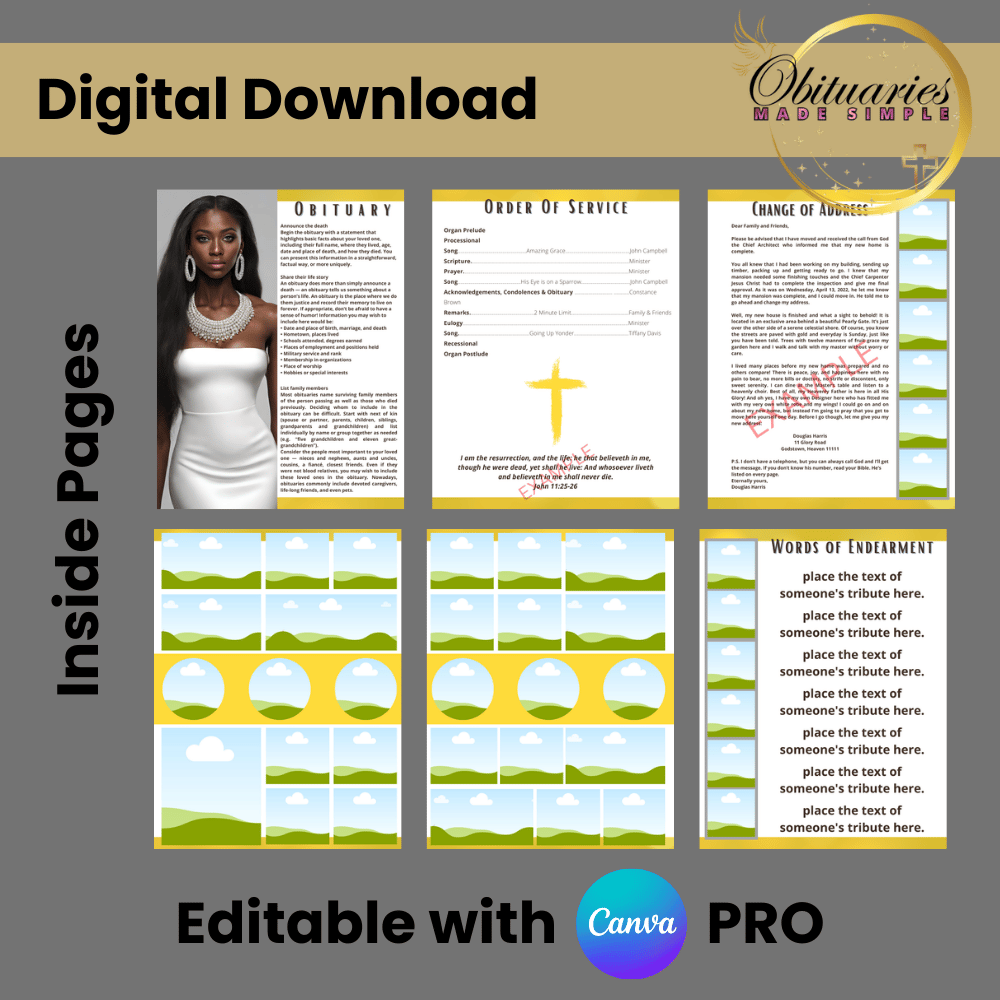 - (Cover, Obituary, Order of Service, Tributes, Photo Collage, and more)