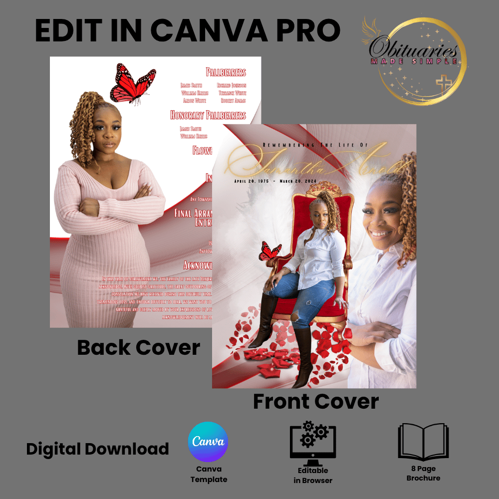 - 8 thoughtfully designed, fully editable pages (Cover, Obituary, Order of Service, Tributes, Photo Collage, and more)