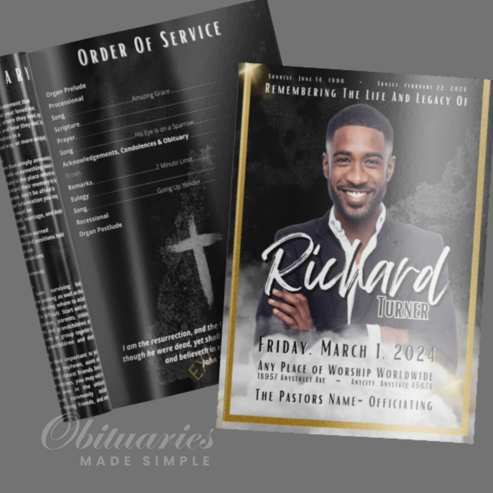 Create a dignified and beautiful tribute with our Black and Gold Clouds Funeral Program Template. This elegant 8-page design features a sophisticated black background accented with soft gold cloud motifs — symbolizing peace, grace, and remembrance.
