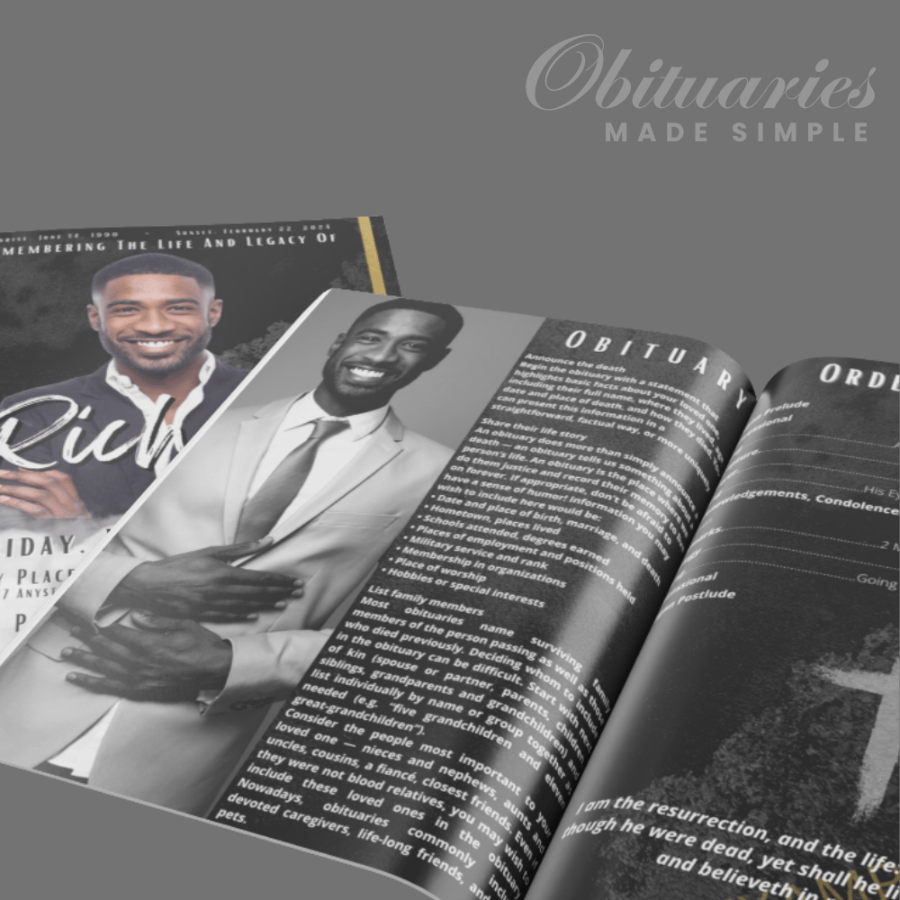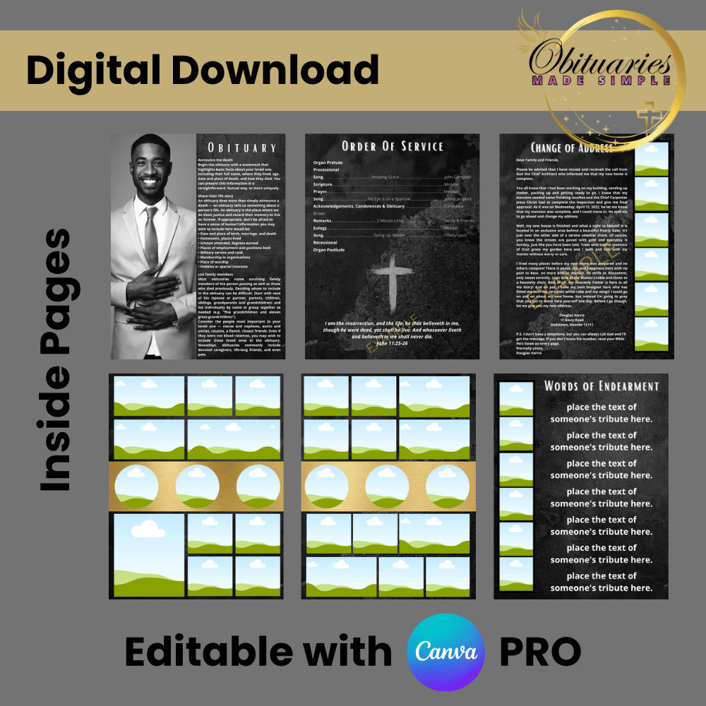 - 8 beautifully designed, fully editable pages (Cover, Obituary, Order of Service, Tributes, Photo Collage, and more)