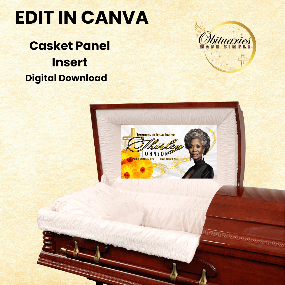 Create a touching tribute with our Yellow Flowers and Cross Casket Panel Inserts Template. This beautifully designed digital download is perfect for honoring your loved one in a meaningful way. Easy to customize in Canva Pro, this template allows you to add personal touches that reflect their life and spirit.