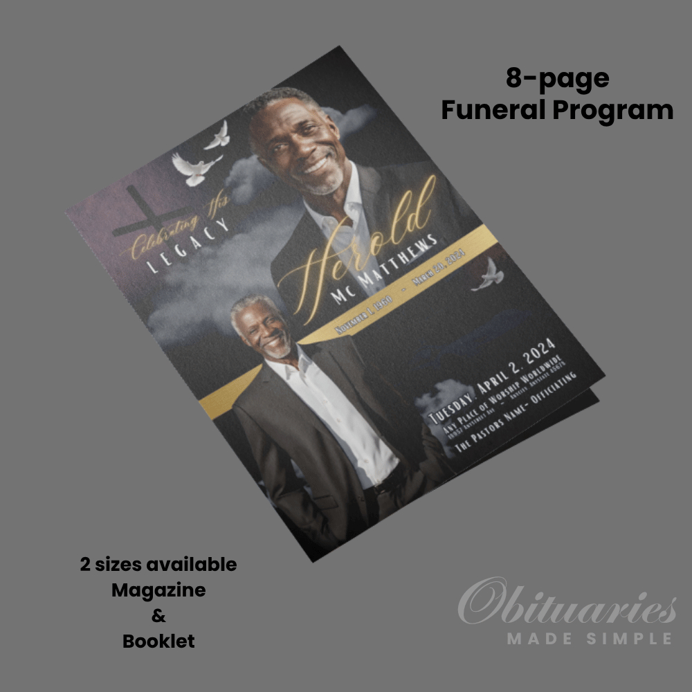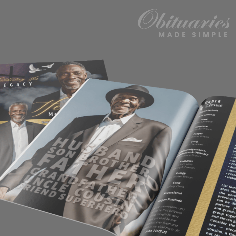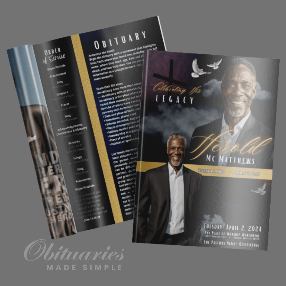 At Obituaries Made Simple, we understand that every program tells a sacred story. The “Navy Cross Gold” template was created to bring comfort, strength, and elegance as you celebrate a life of faith, love, and legacy.