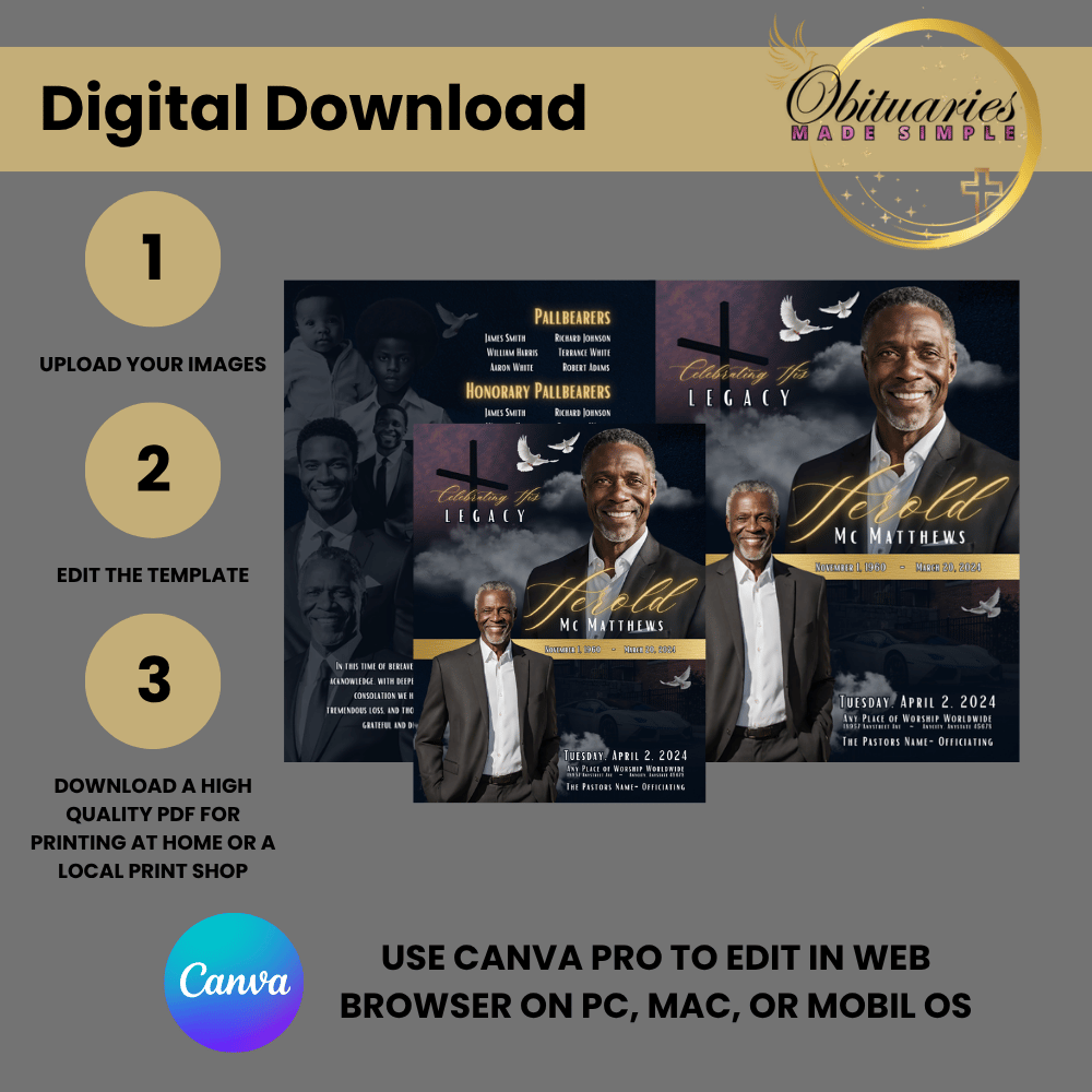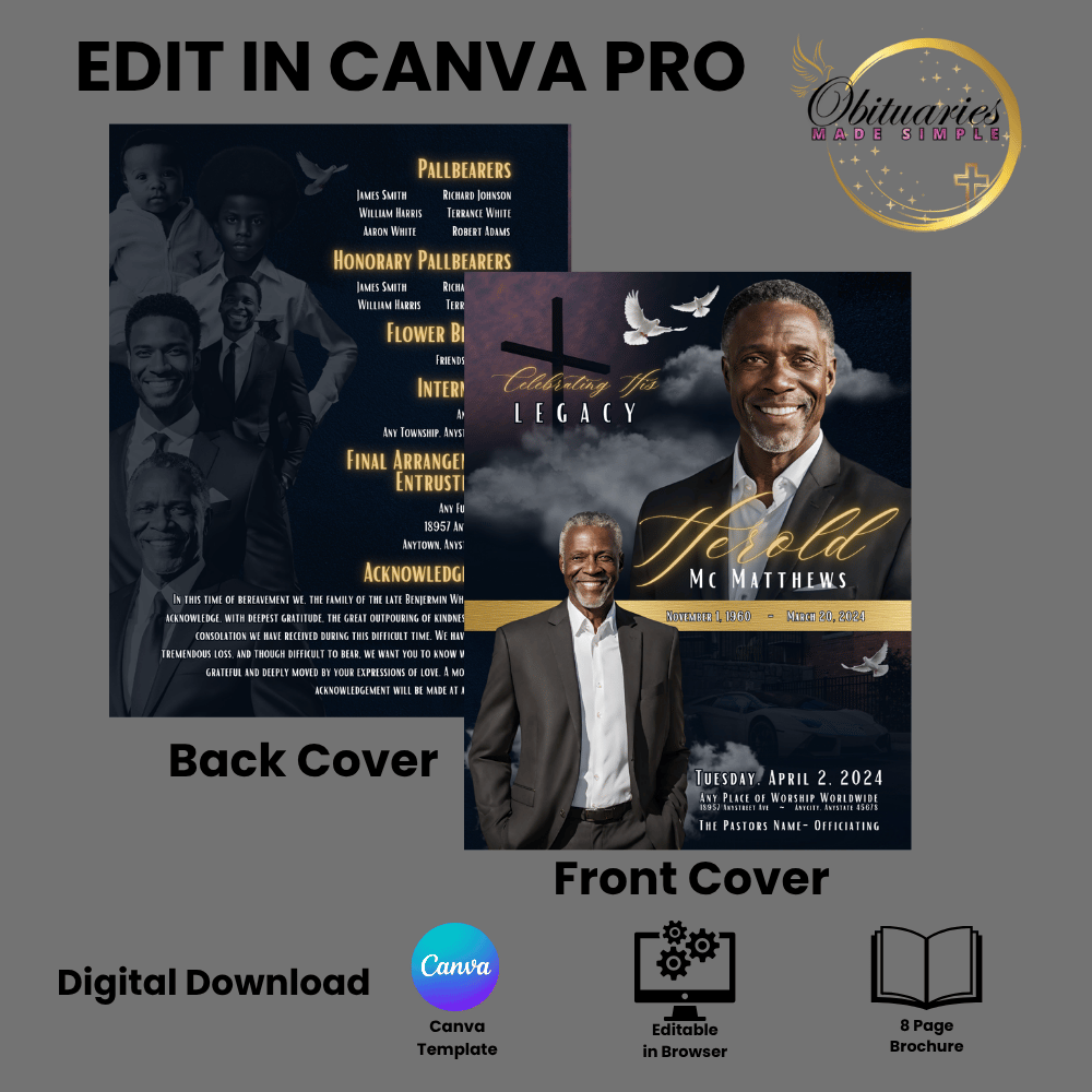 Created in Canva Pro, this template is fully editable, print-ready, and perfect for creating a meaningful keepsake that beautifully celebrates your loved one’s legacy.