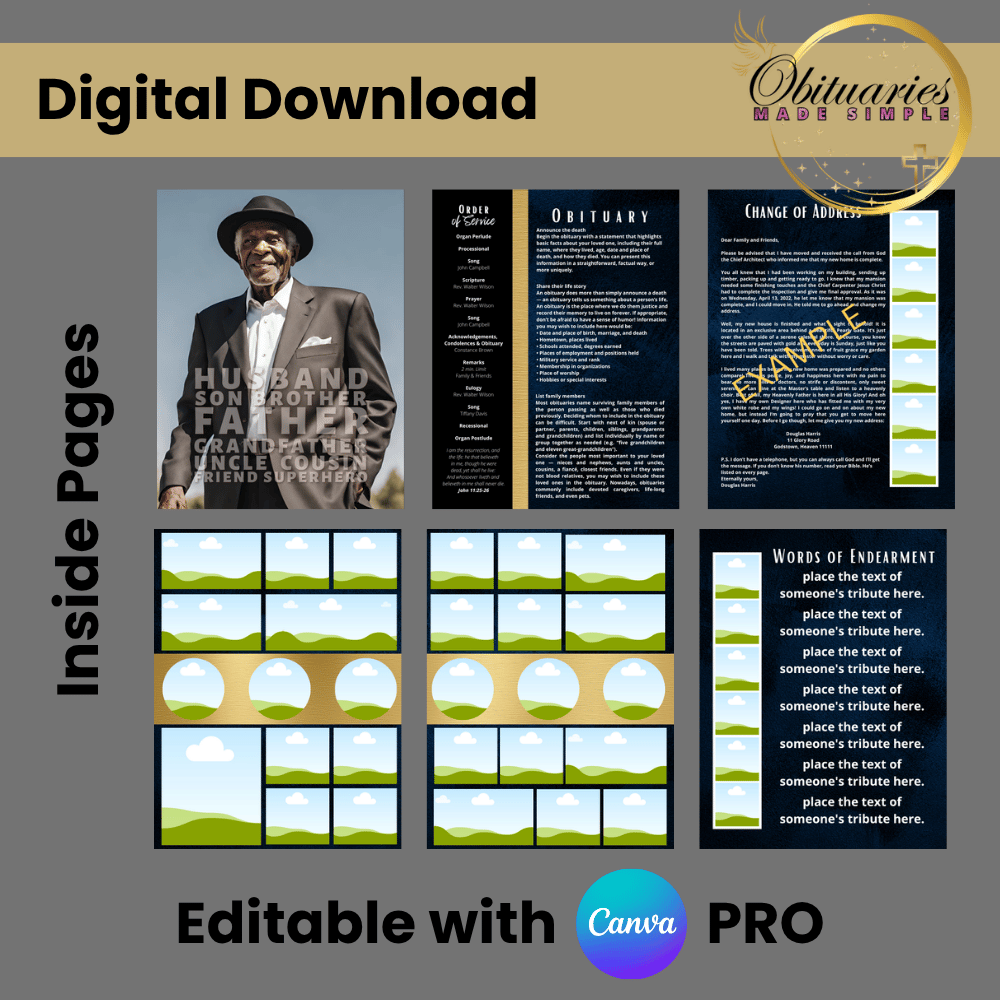 - 8 Fully Editable Pages (Cover, Obituary, Order of Service, Tributes, Photo Collage & more)