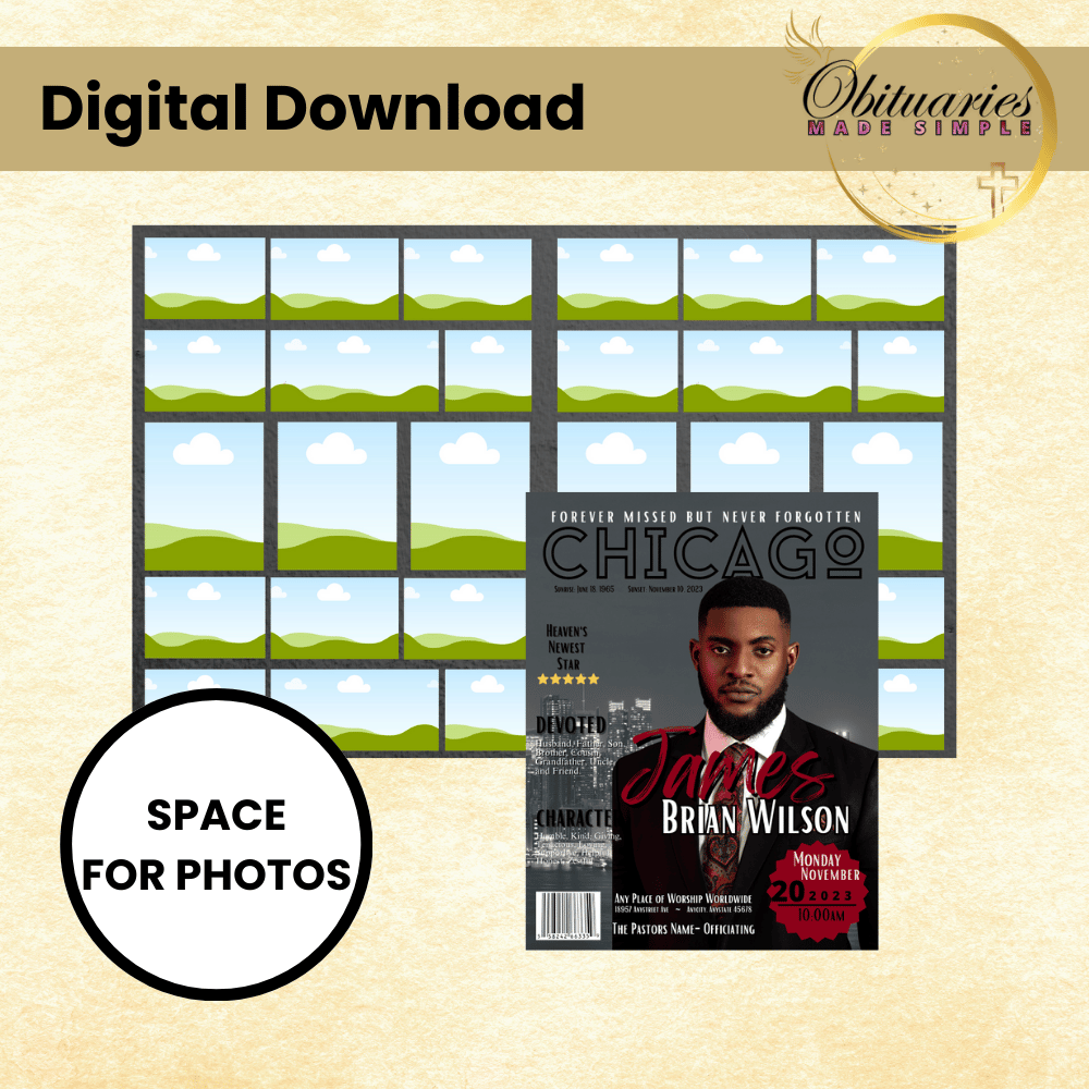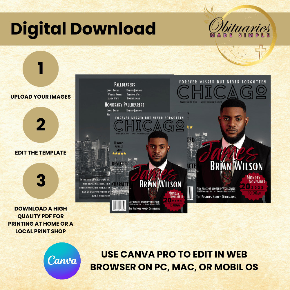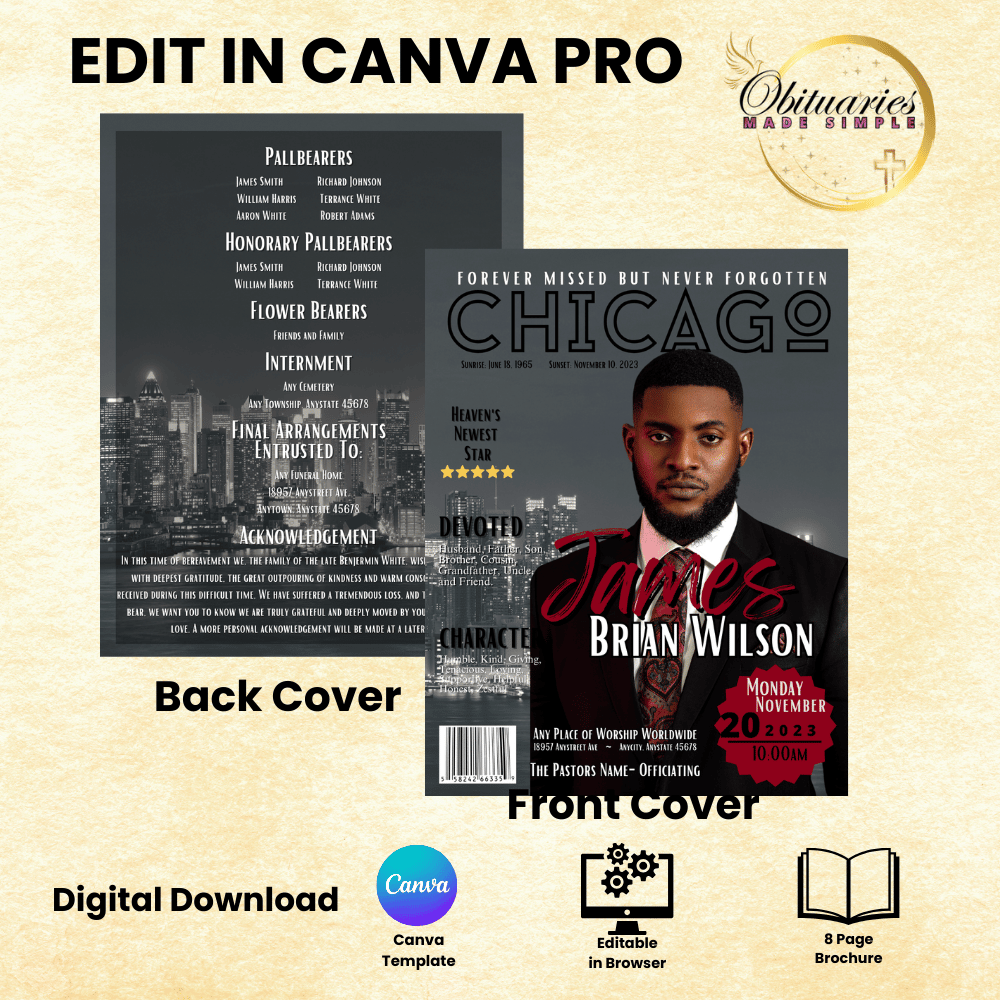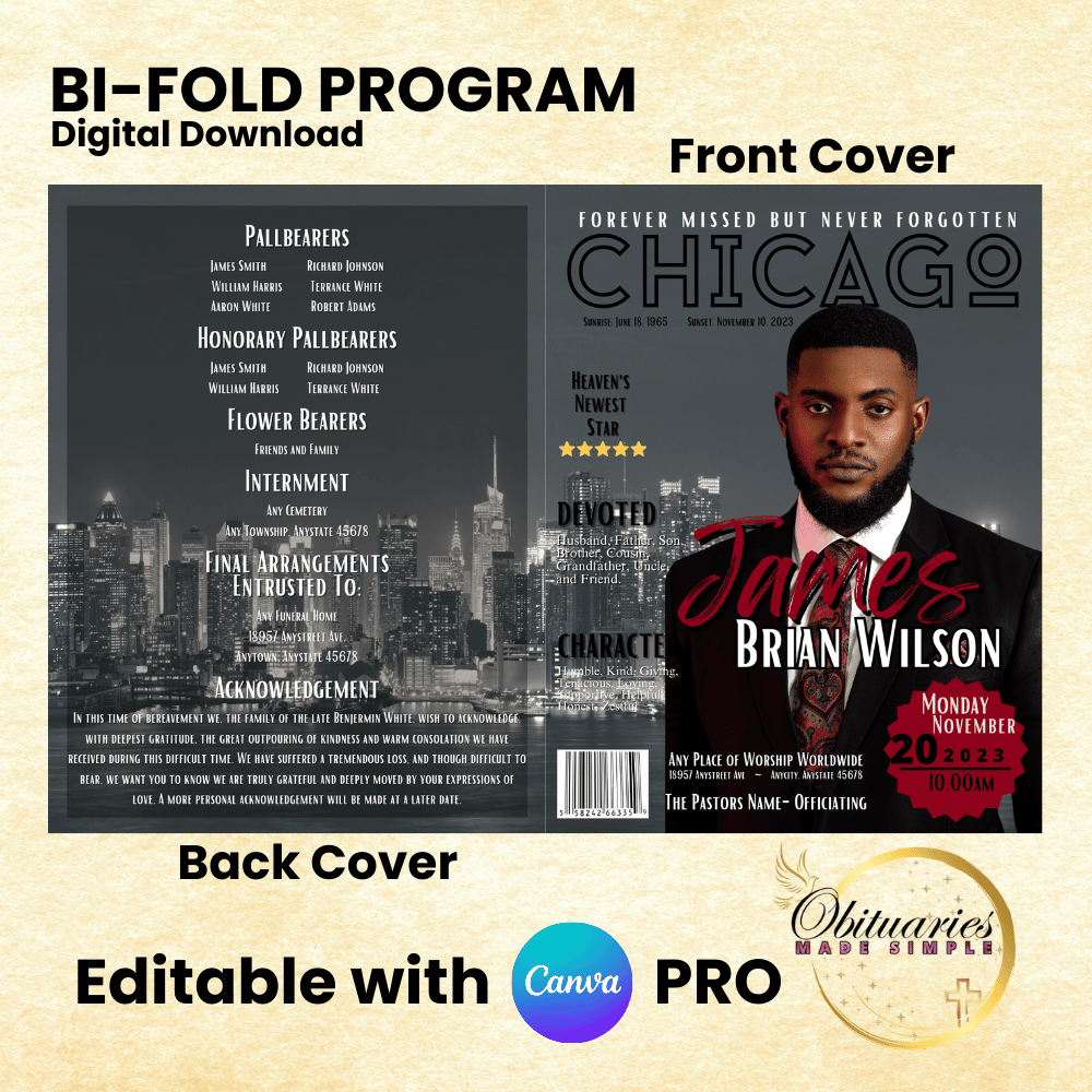 #ChicagoStyleFuneralProgram #EditableInCanva #MagazineStyleObituary #DigitalFuneralTemplate #ElegantMemorialDesign #UrbanObituaryTemplate