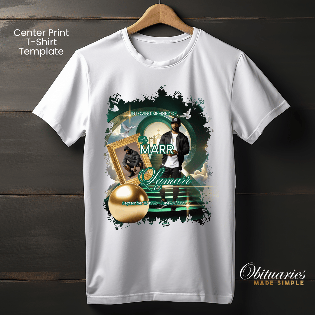 Create a serene and uplifting tribute with our teal green and gold Heaven’s Gate Memorial Shirt Template. Thoughtfully designed for center chest printing, this elegant layout reflects peace, faith, and eternal rest. The soft teal tones combined with radiant gold accents create a beautiful, dignified centerpiece to honor your loved one’s memory.